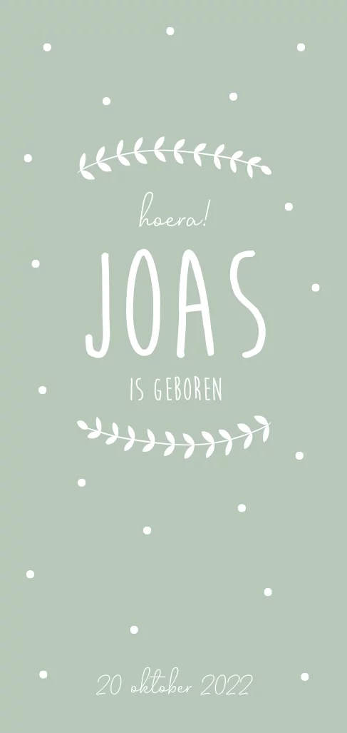 Lief geboortekaartje voor een jongen met ronde hoeken, takjes en stippen. De kaart heeft een mintgroene kleur die je naar wens kunt aanpassen.