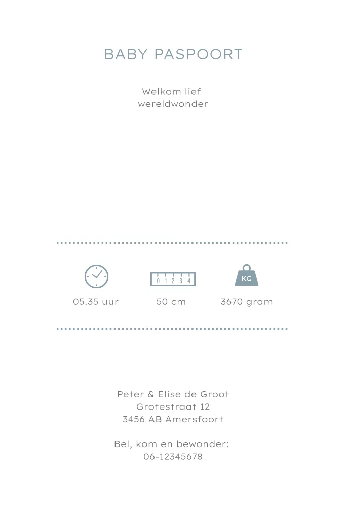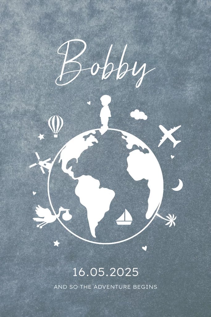 Een geboortekaartje voor jullie wereldwonder in een paspoort vorm. Super leuk als jullie van reizen houden! Het geboortekaartje heeft een blauwe velvet look achtergrond met een wereldbol, vliegtuig en is afgewerkt met goudfolie. De kaart heeft afgeronde hoeken. Pas de kleuren van de kaart en de folie naar wens aan.