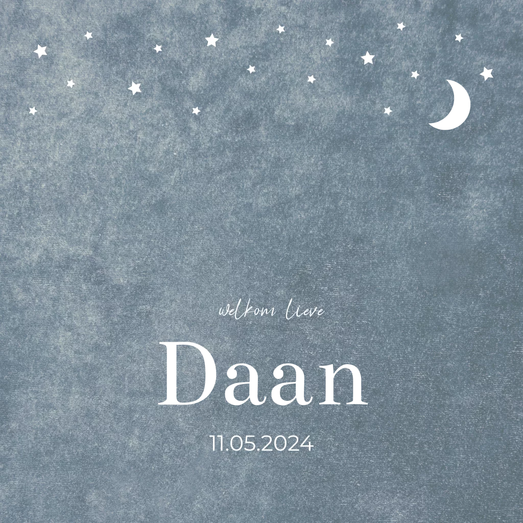 Dubbel gevouwen geboortekaartje met een blauwe velvet look achtergrond met maan, sterren en goudfolie. Pas de kleur van de kaart en de folie naar wens aan.