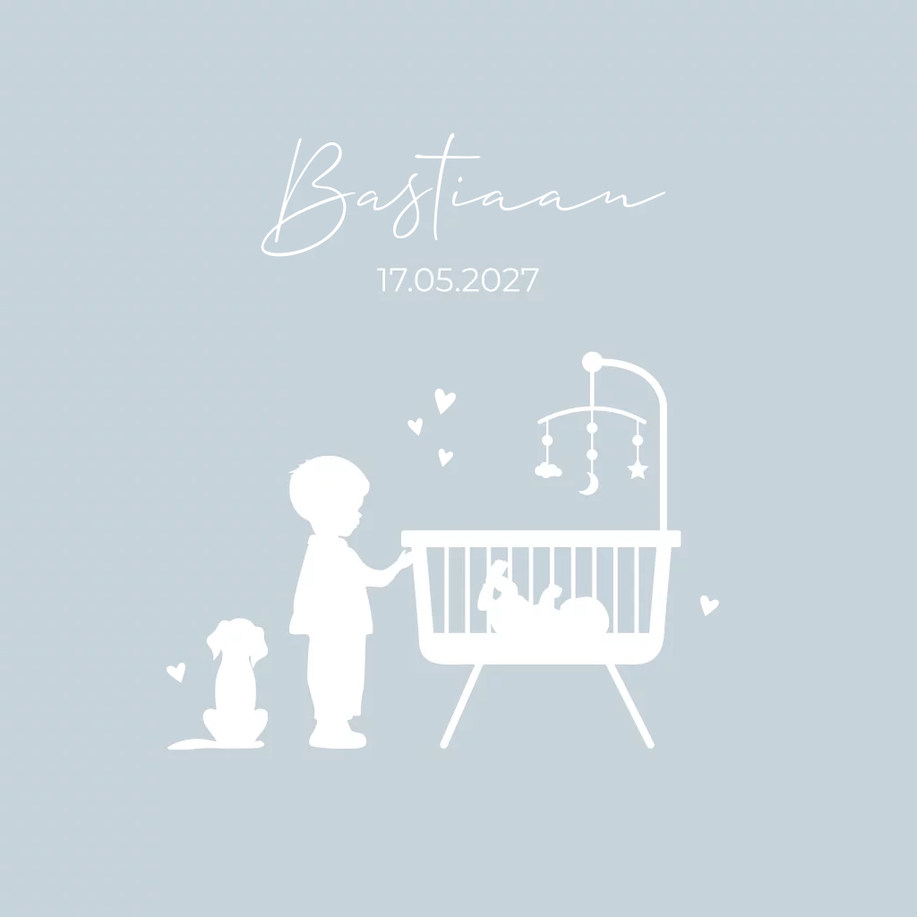 Lief dubbel gevouwen geboortekaartje in een lichtblauwe kleur met silhouetten van een wieg, hond en grote broer. Pas de kleur van de kaart naar wens aan. Het kaartje heeft ronde hoeken en is afgewerkt met goudfolie. In de beeldbank kun je de silhouetten nog naar wens aanpassen naar jullie gezinssamenstelling.