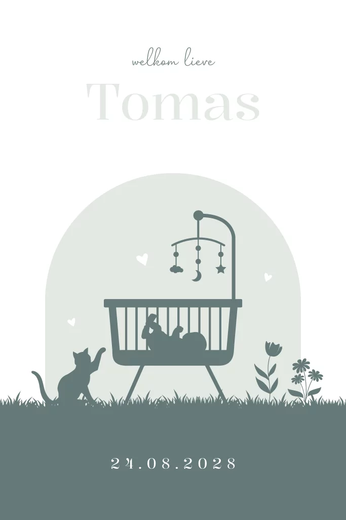 Dit geboortekaartje voor een jongen in een groene kleur heeft silhouetten van een wieg en dieren. Pas de kleur van de kaart naar wens aan. In de beeldbank kun je de silhouetten nog naar wens aanpassen.