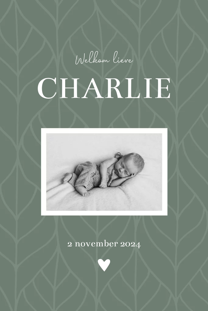 Dubbel gevouwen kaartje in een legergroene kleur met een patroon van bladeren op de achtergrond. De buitenzijde van de kaart heeft goudfolie. De foto kun je vervangen door een foto van jullie kindje.