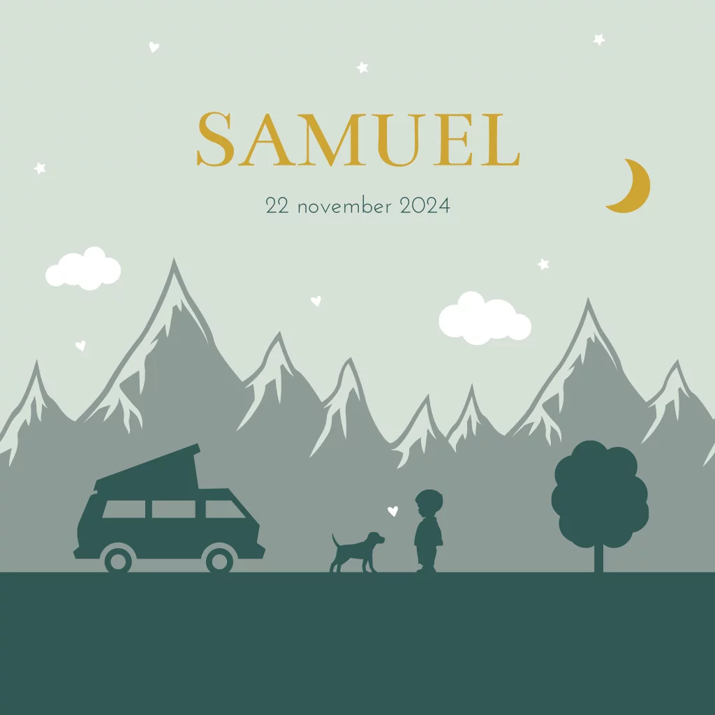 Leuk geboortekaartje voor een jongen, met een camper, bergen en sterren. Dit kaartje past helemaal bij jullie als jullie gek zijn op kamperen en reizen. Pas de silhouetten aan van kleur of kies andere vormen uit de beeldbank.