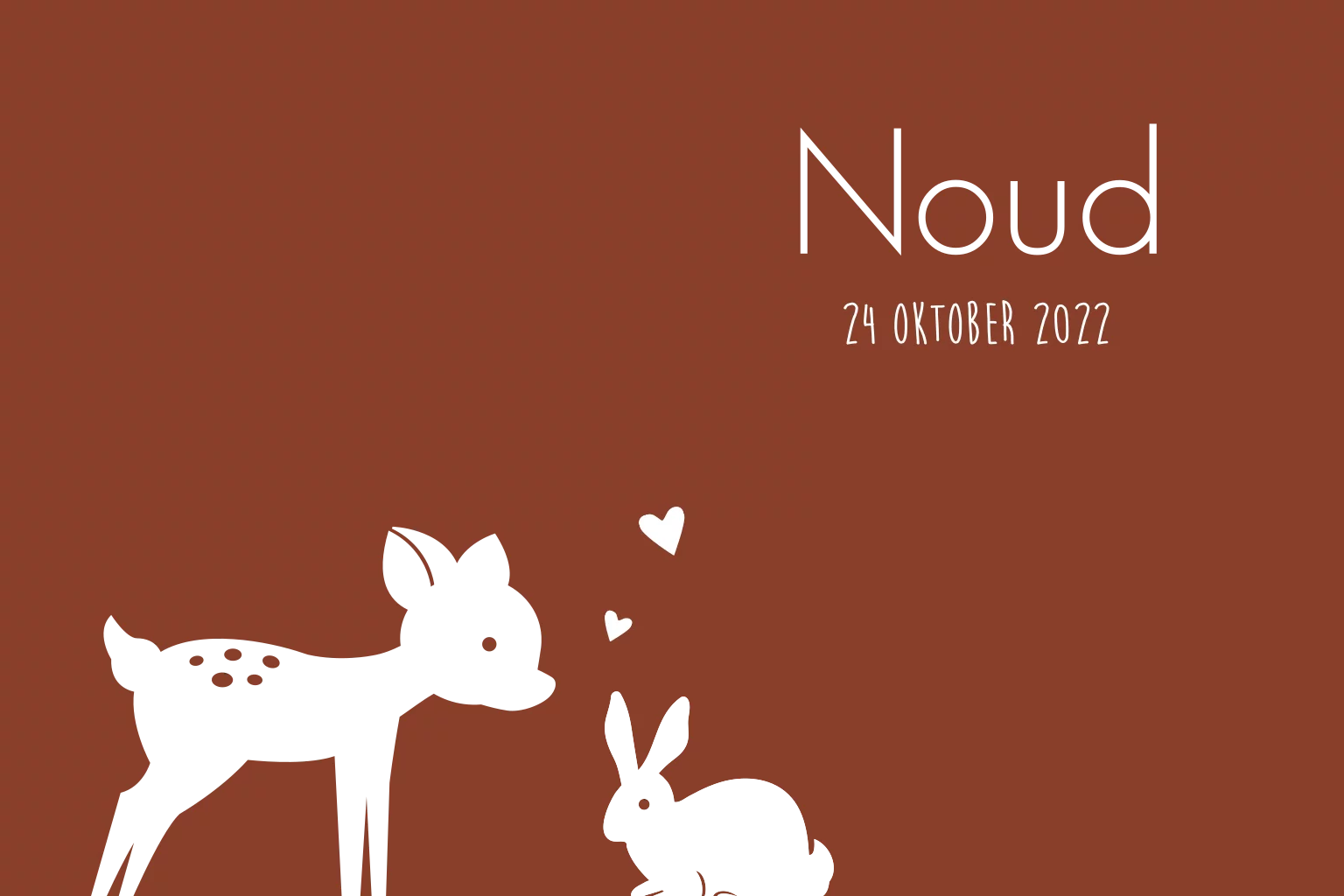 Dubbel gevouwen geboortekaartje in een rode kleur met een hertje en konijn in rosefolie. Pas de kleur van de kaart en de folie naar wens aan.