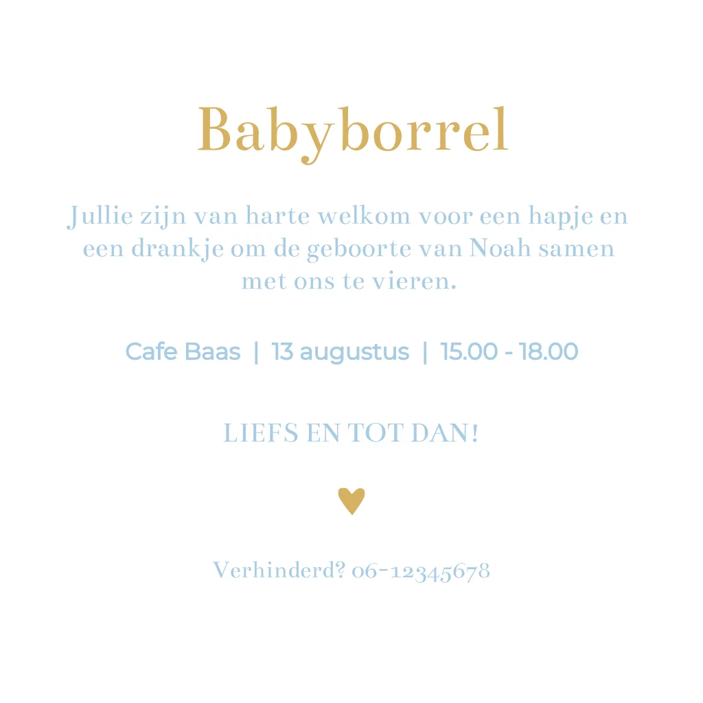 Kraamfeest uitnodiging babyborrel Noah klassiek wit blauw