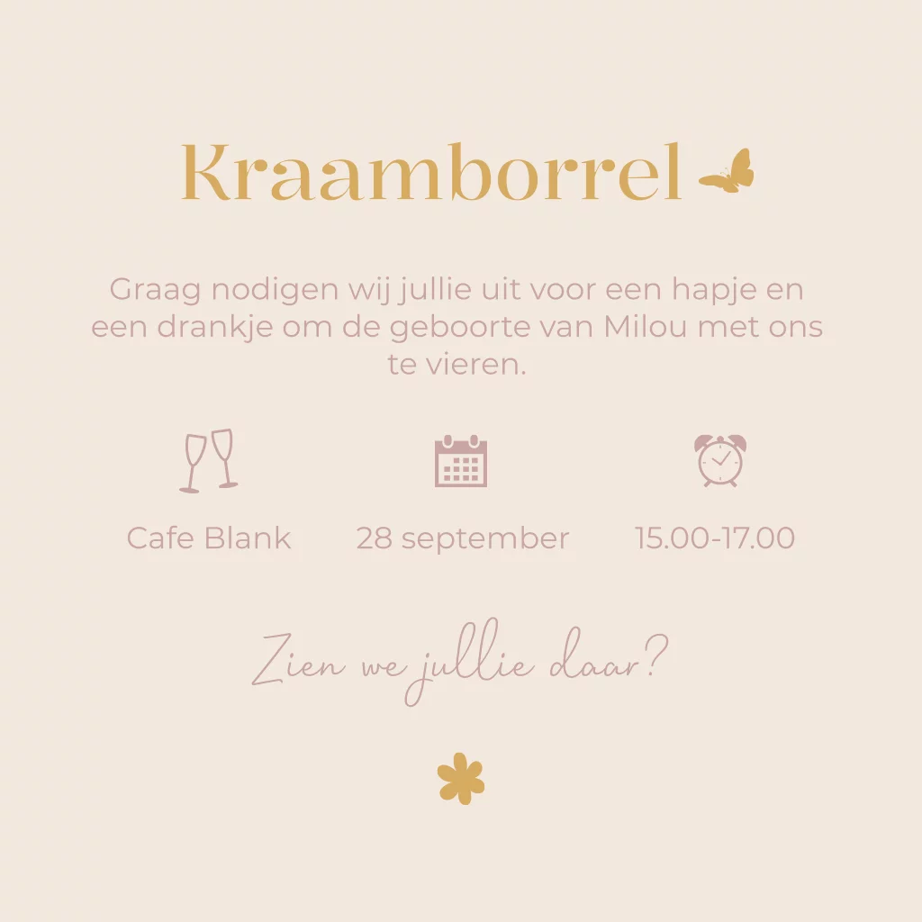 Kraamfeest uitnodiging kraamborrel Milou crème vlinder bloem