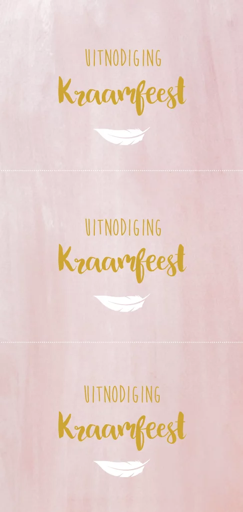 Roze DIY-label met 3 kraamfeestkaartjes van 10x7 cm voor bij het geboortekaartje. De kaartjes zijn roze en hebben een witte veer op de voorkant. De kaartjes zijn volledig aan te passen naar wens, zodat het aansluit bij de stijl en kleur van jullie geboortekaartje. De labels knip of snij je zelf nog. Op de kaartjes zie je nu op de voorzijde snijlijnen. Maar als je deze print, zie je deze alleen nog maar op de achterzijde. Hierdoor zijn ze niet meer zichtbaar aan de voorkant en zijn de labels netjes na het uitsnijden.