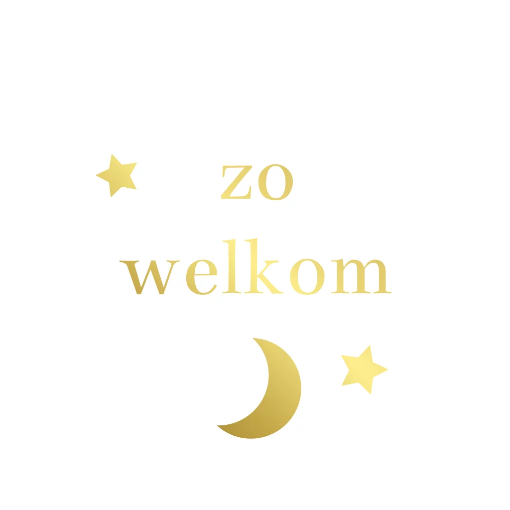 Een rond label met maan en sterren in goudfolie en boorgaatje voor bij het geboortekaartje of aan doopsuiker. Het ronde label heeft een formaat van 40x40 mm en is voorzien van een klein boorgaatje. Pas het label helemaal aan in de kleuren en stijl van jullie kaart.