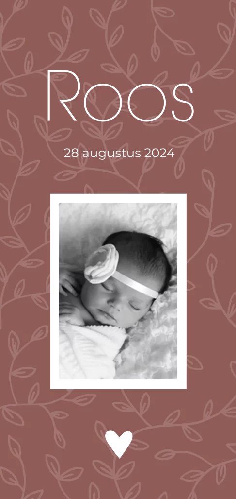 Dit geboortekaartje heeft een mooie steenrode kleur met een achtergrond van getekende blaadjes en goudfolie. De kleur van de kaart en de folie kun je naar wens aanpassen. Vervang de foto door een foto van jullie kindje. TIP: je kunt ook het fotokader verwijderen en een los DIY-fotokaartje aan de kaart vastmaken met bijvoorbeeld een paperclip. Qua formaat staat een fotokaartje van 8,5x5,5 cm hier het mooiste bij.