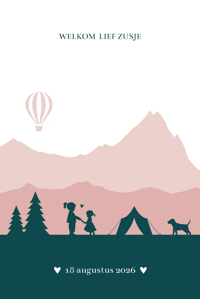 Houden jullie van reizen en kamperen? Dit lieve geboortekaartje voor een meisje past bij een nieuw avontuur! Op het kaartje staan bergen, een tent, luchtballon, een hond en twee zusjes, maar je kunt de silhouetten zelf nog naar wens aanpassen. In de beeldbank kun je allemaal plaatjes vinden die je kunt toevoegen: zo maak je er een heel persoonlijk geboortekaartje van!