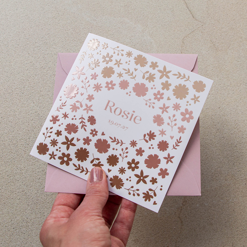 Lief geboortekaartje voor een meisje met een patroon van bloemen in hoogglans lak. Het kaartje heeft een kleurverloop van beige naar oudroze. Aan de binnenzijde is plaats voor een gedichtje.
