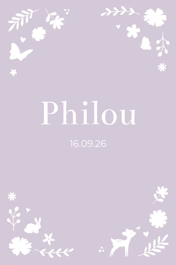 Lief vintage geboortekaartje met bloemen, vlinders, konijntje en een hertje. Het kaartje heeft ronde hoeken en een lila achtergrondkleur met goudfolie elementen. Pas de kleuren van de kaart helemaal naar wens aan.