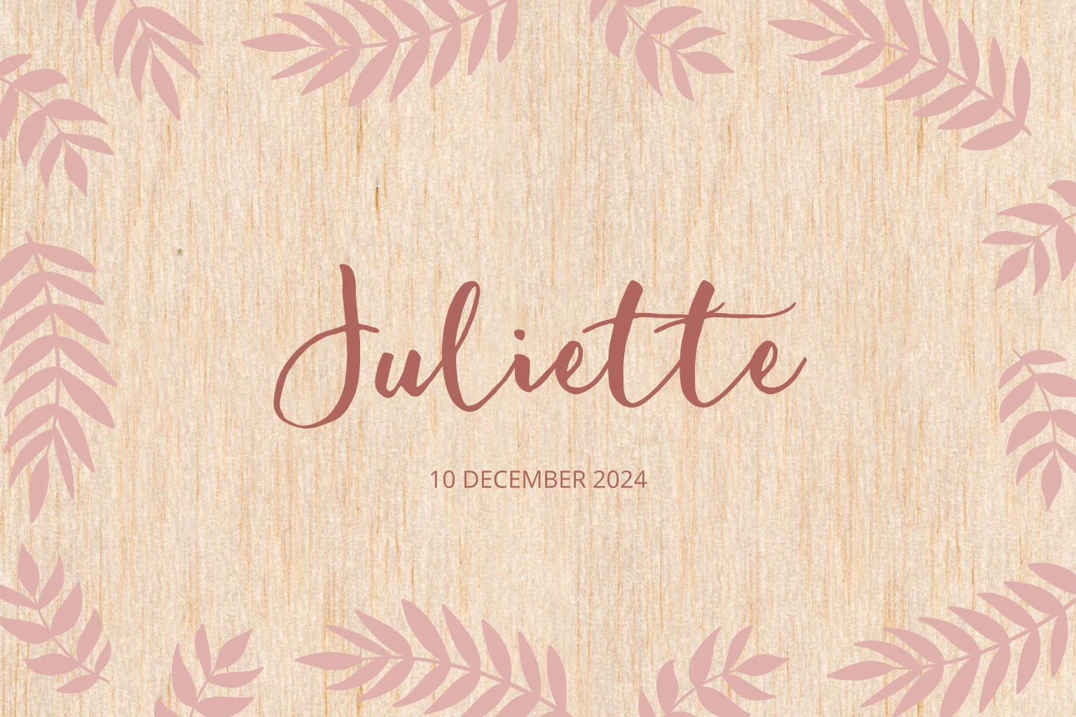 Dit unieke geboortekaartje is op hout gedrukt. Het geboortekaartje voor meisjes heeft roze botanisch takjes als rand van de kaart. Pas de kleur van dit trendy kaartje helemaal naar wens aan.