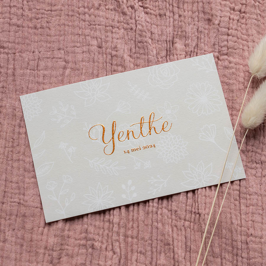Creme geboortekaartje met een patroon van getekende bloemen. De kaart heeft aan beide zijden rosefolie. Pas de kleuren van de kaart en de folie naar wens aan.
