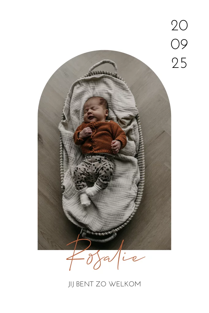 Modern geboortekaartje met boogvorm en foto. Plaats een mooie foto van jullie kindje op de kaart. Pas de kleuren en de lettertypes naar wens aan. Fotografie: Celebrate Photography.nl