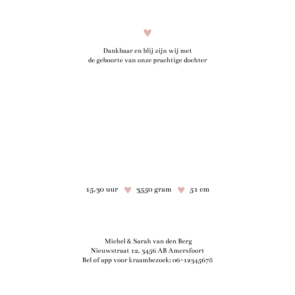 Een klassiek en lief geboortekaartje voor een meisje met een lint. De kaart heeft een witte achtergrond en hartjes in rosefolie en oudroze. Het zijden lint mag je er nog los bij bestellen en is beschikbaar in verschillende kleuren.