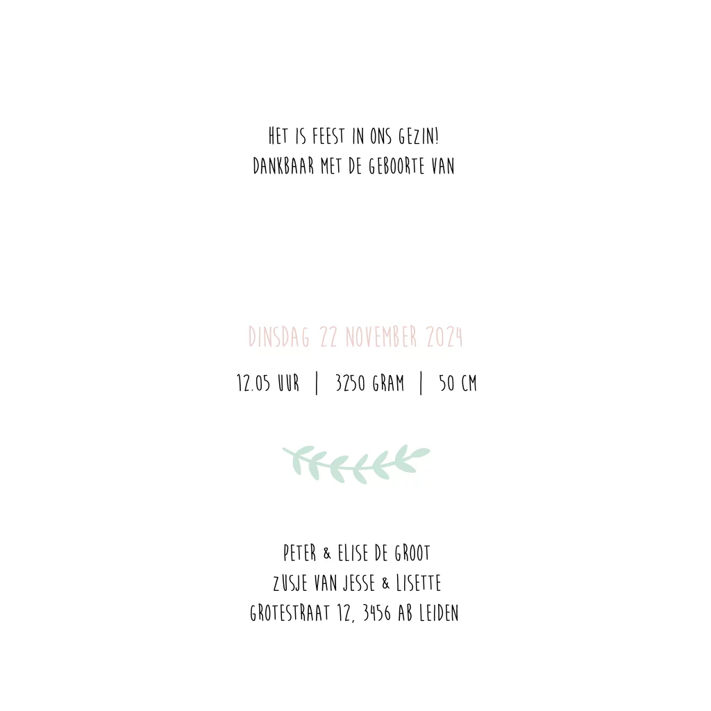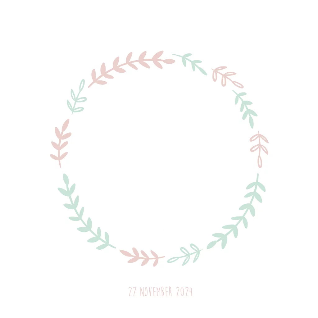 Lief dubbel gevouwen geboortekaartje met rosefolie en een krans van takjes in lichtroze en mintgroen. Aan de binnenzijde is plaats voor een gedichtje. De kleur van de kaart en de folie kun je naar wens aanpassen.