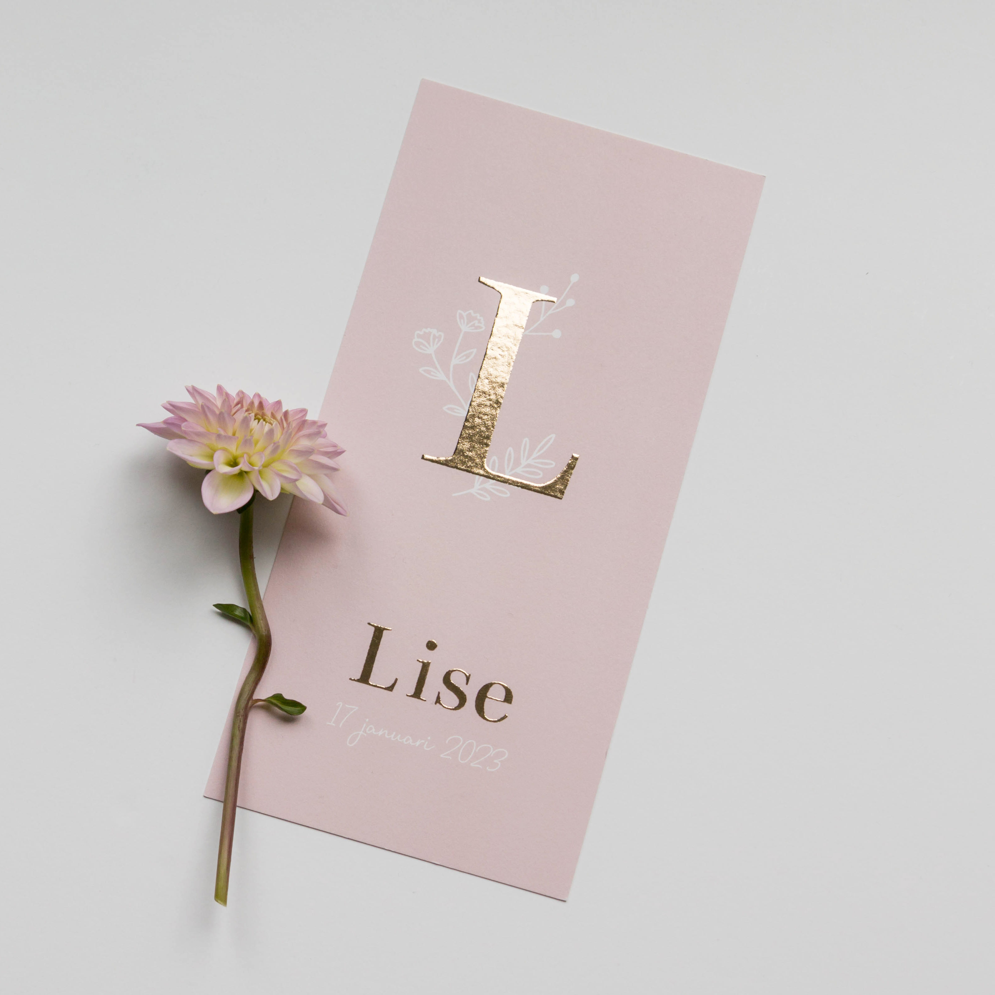Geboortekaartje meisje met goudfolie letter en bloemen