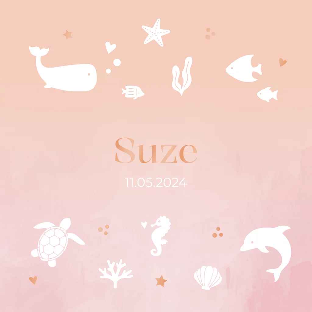 Vrolijk geboortekaartje met oceaan thema in een dubbelgevouwen formaat. Dit roze en oranje kaartje met zeedieren is afgewerkt aan de buitenzijde met hoogglans folie in de kleur oranje. Pas de kleuren van de kaart nog naar wens aan.
