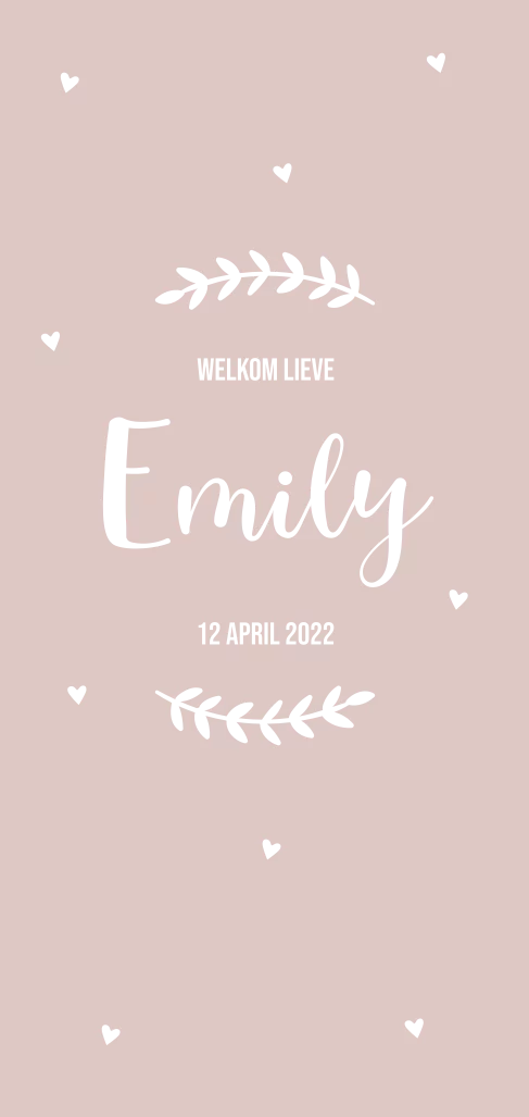 Dit geboortekaartje heeft een mooie oud roze kleur en op de voorzijde de naam, takjes en hartjes in goudfolie. De kleur van de kaart en de folie kun je aanpassen naar wens.