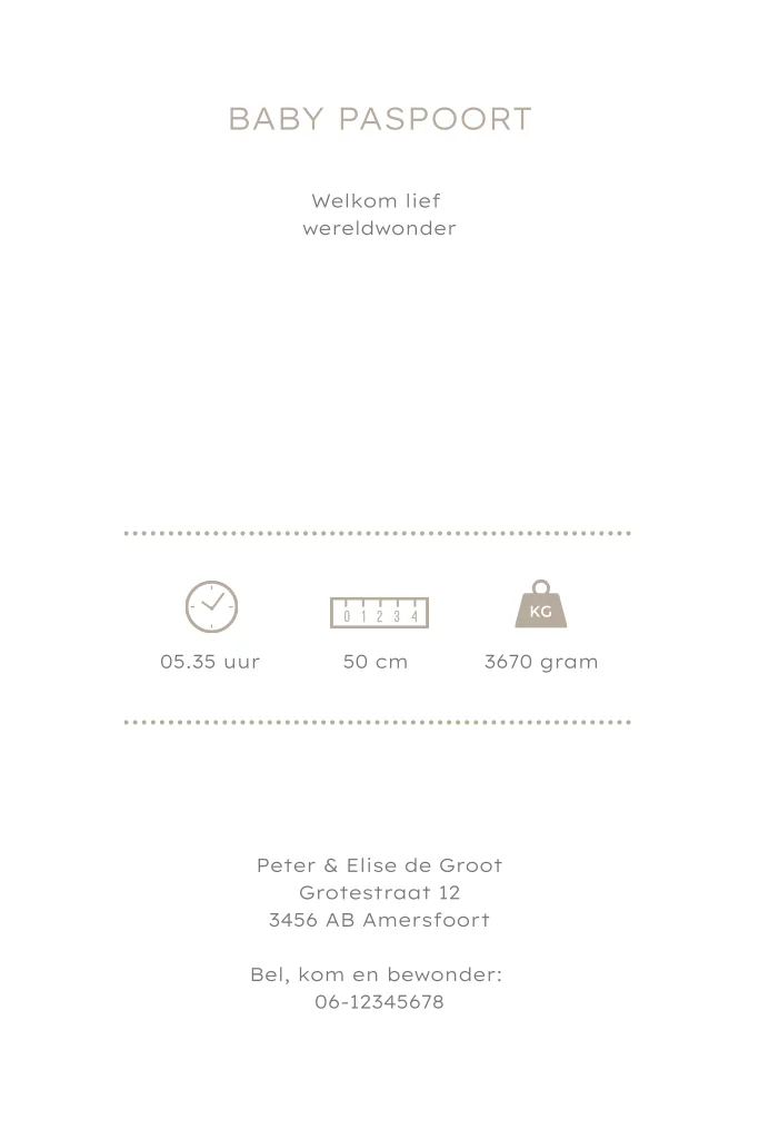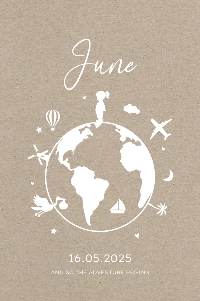 Een geboortekaartje voor jullie wereldwonder in een paspoortvorm. Super leuk als jullie van reizen houden! Het geboortekaartje heeft een kraftlook achtergrond met een wereldbol, vliegtuig en is afgewerkt met rosefolie. De kaart heeft afgeronde hoeken. Pas de kleuren van de kaart en de folie naar wens aan.