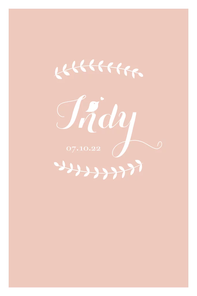 Een lief geboortekaartje in de kleur peach met een vogeltje op de naam. Vul de naam in van jullie kindje en plaats het vogeltje op een letter van de naam. De kleur van de kaart kun je naar wens aanpassen.