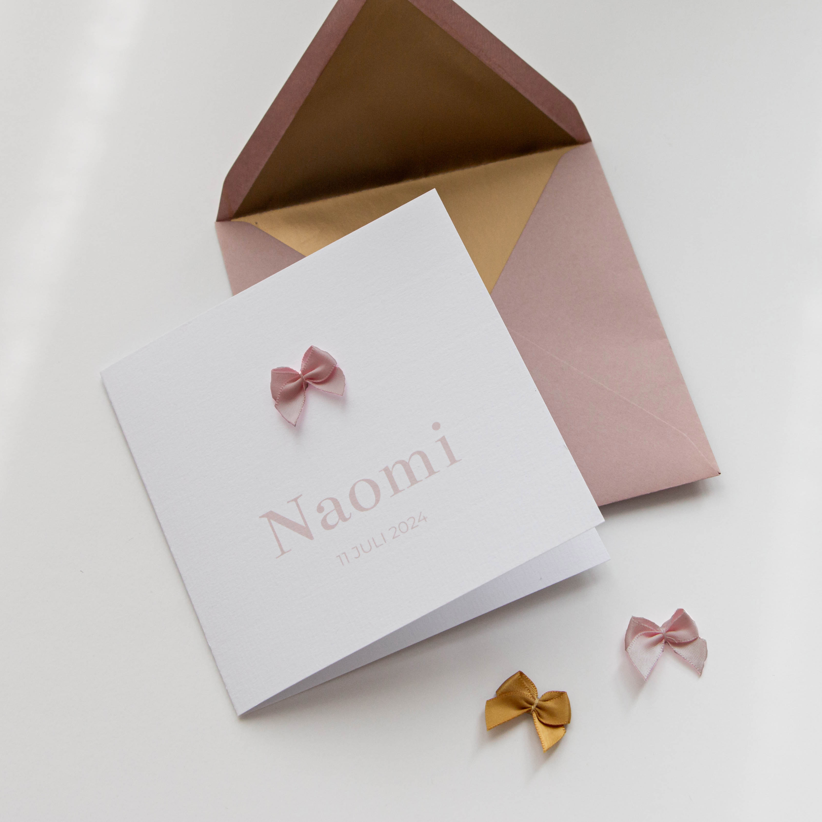 Een minimalistisch en klassiek dubbelgevouwen geboortekaartje met een echt strikje. LET OP: de strikjes worden niet standaard meegeleverd, deze kun je zelf toevoegen tijdens het bestelproces. Hier kun je alle strikjes vinden. Wanneer je de geboortekaartjes ontvangt, kun je de strikjes zelf opplakken.