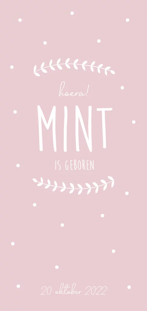 Lief geboortekaartje voor een meisje met ronde hoeken, takjes en stippen. De kaart heeft een lichtroze kleur die je naar wens kunt aanpassen.
