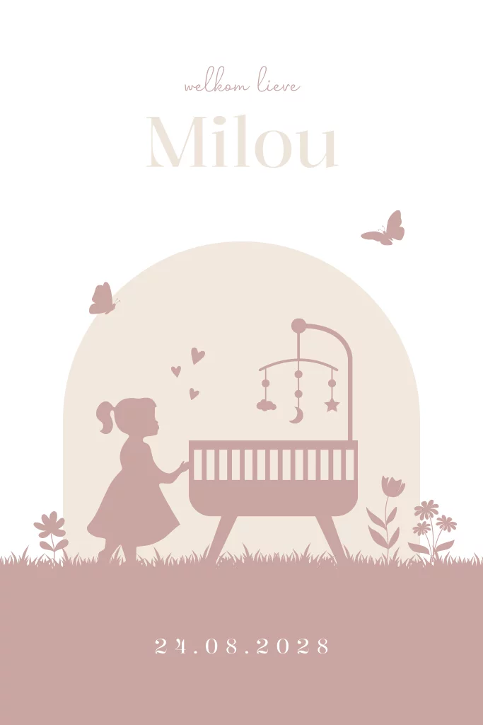 Dit geboortekaartje voor een meisje in een roze kleur heeft silhouetten van een wieg, grote zus en bloemen. Pas de kleur van de kaart naar wens aan. In de beeldbank kun je de silhouetten nog naar wens aanpassen.