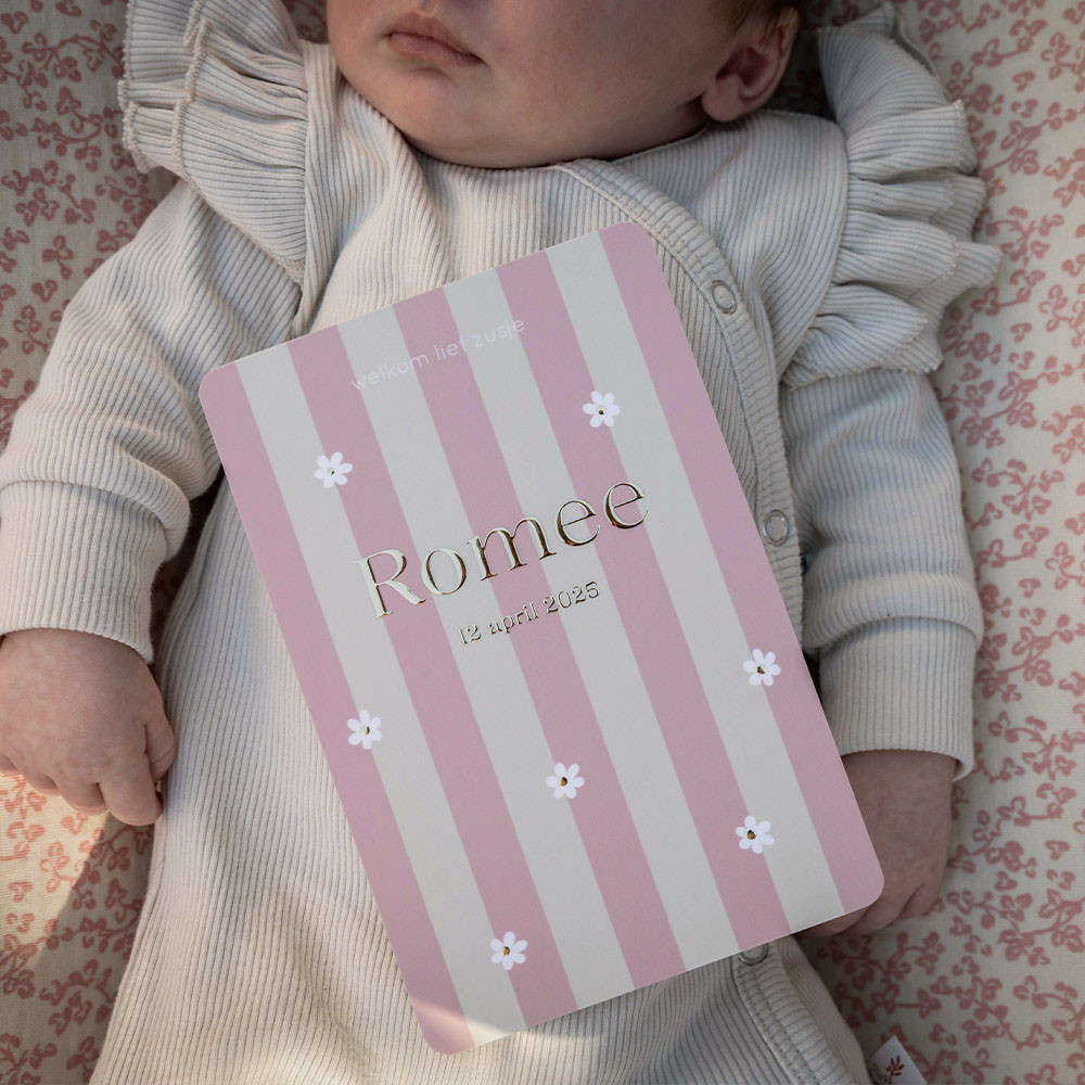 Lief en modern geboortekaartje voor een meisje met roze en beige streepjes. Op het kaartje staan kleine witte bloemetjes en de geboortekaart is afgewerkt met glimmende goudfolie en ronde hoeken. Pas de kleuren van de kaart nog naar wens aan.