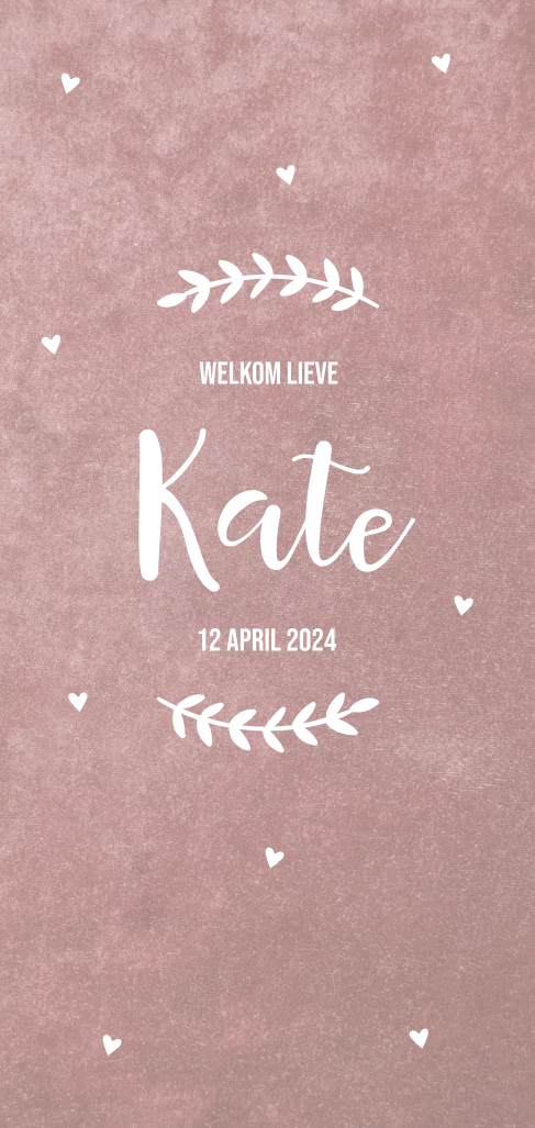 Dit geboortekaartje heeft een roze velvet look achtergrond met takjes en hartjes in goudfolie. De kleur folie kun je aanpassen naar wens.