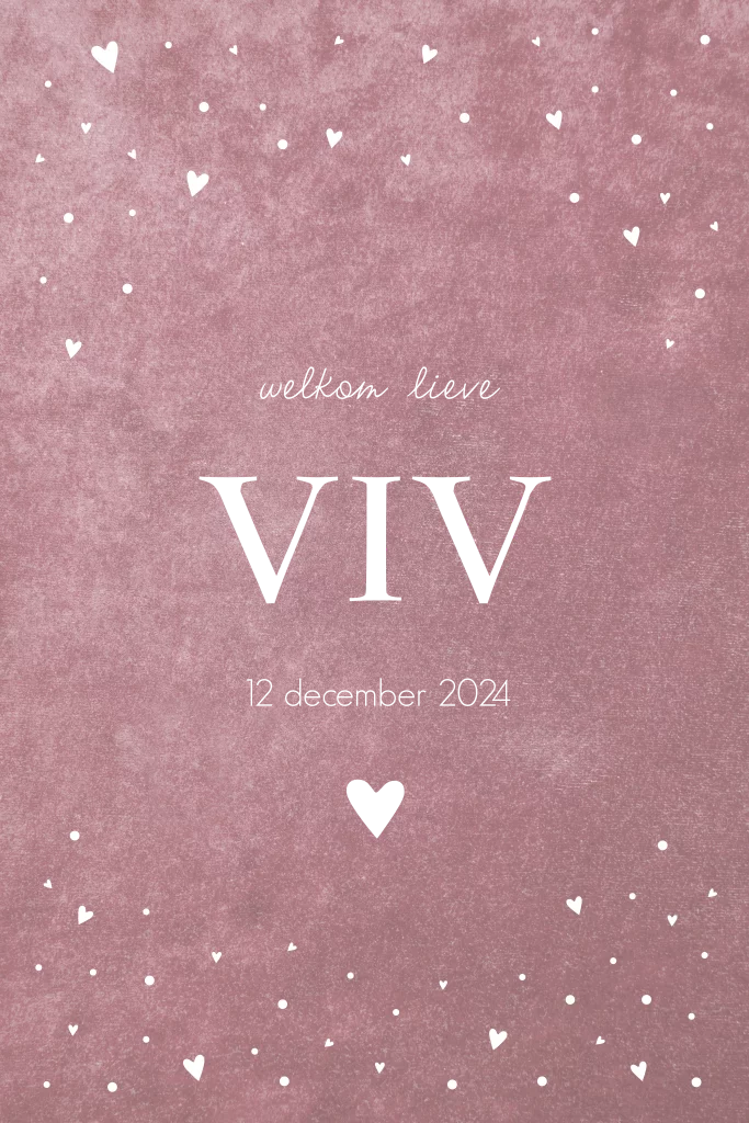 Geboortekaartje met oudroze velvet look achtergrond met witte hartjes, rosefolie en ronde hoeken. De kleur van de kaart en de folie kun je naar wens aanpassen.