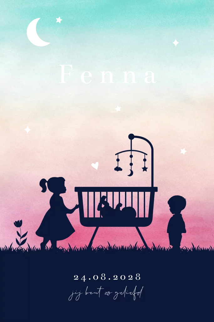 Geboortekaartje meisje wieg silhouet sterrenhemel