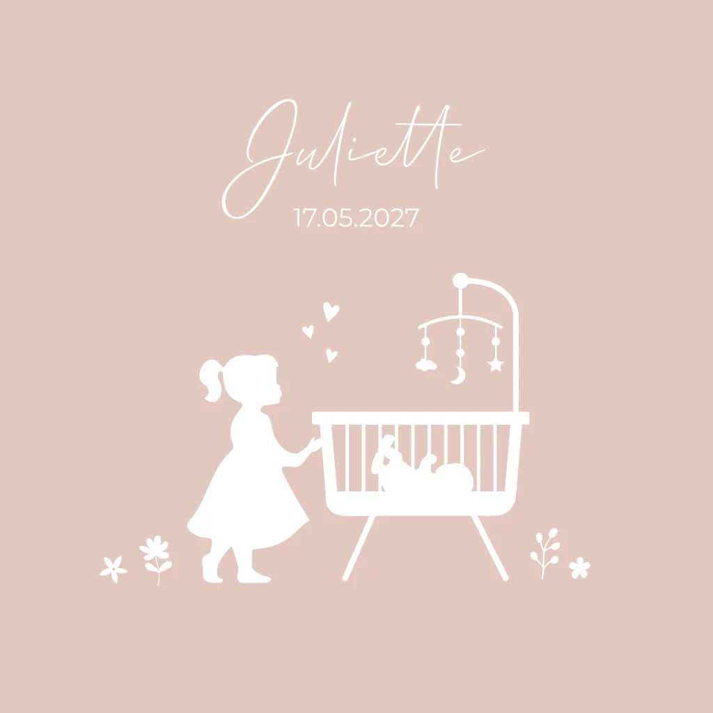 Lief dubbel gevouwen geboortekaartje in een oud roze kleur met silhouetten van een wieg en grote zus. Pas de kleur van de kaart naar wens aan. Het kaartje heeft ronde hoeken en is afgewerkt met goudfolie.