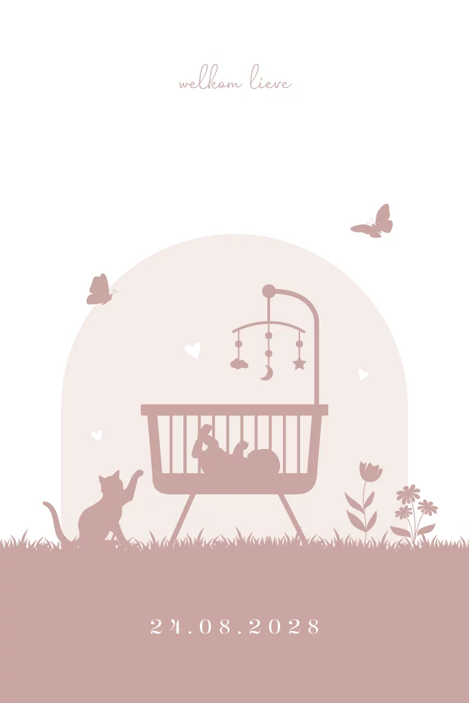 Dit geboortekaartje voor een meisje in een roze kleur heeft silhouetten van een wieg en dieren. Pas de kleur van de kaart naar wens aan. Het kaartje is afgewerkt met rosefolie. In de beeldbank kun je de silhouetten nog naar wens aanpassen.