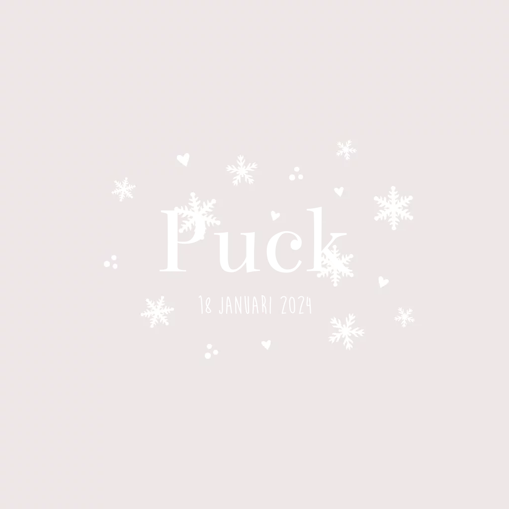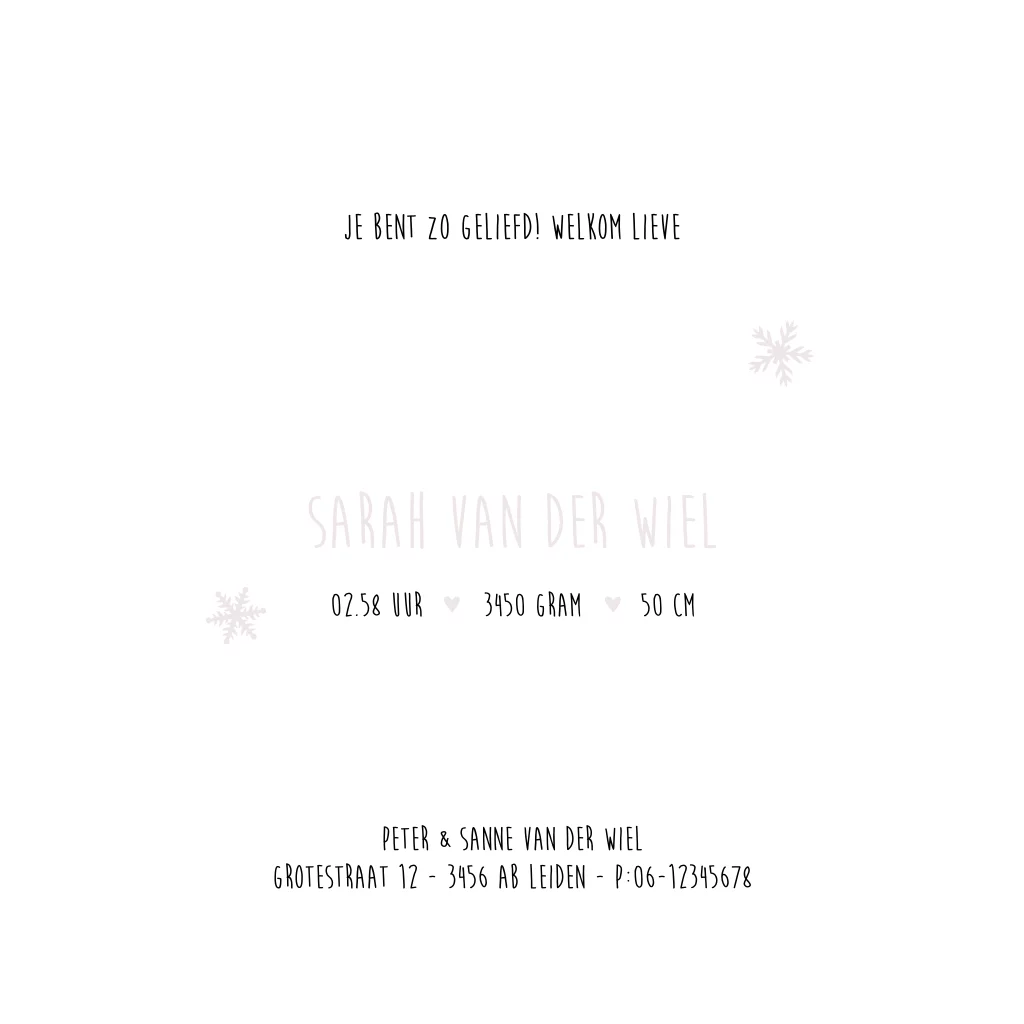 Winterse geboorteaankondiging met charmante sneeuwvlokjes en de naam in prachtig goudfolie. Binnenin is er ruimte voor een lief gedichtje. Personaliseer de kaartkleur en folie naar jouw voorkeur.