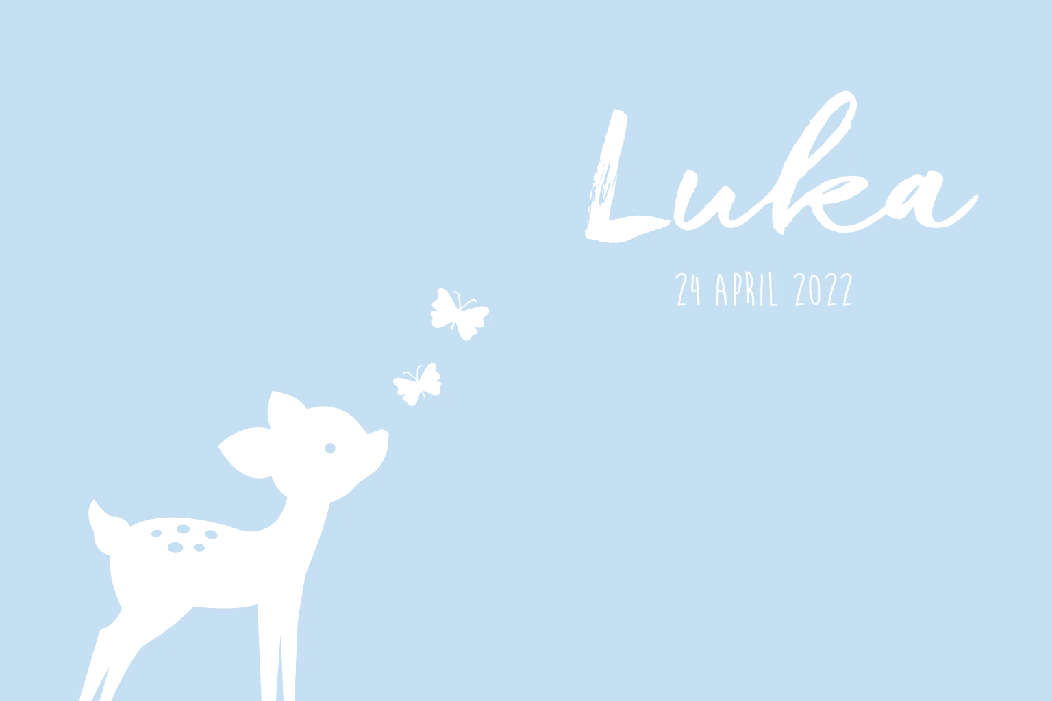 Een lief lichtblauw geboortekaartje voor een jongen. Het kaartje is versierd met een hertje en vlindertjes in goudfolie. Er is in de binnenzijde plaats voor een klein gedichtje. Je past de kleur van de folie en kaart aan naar wens.