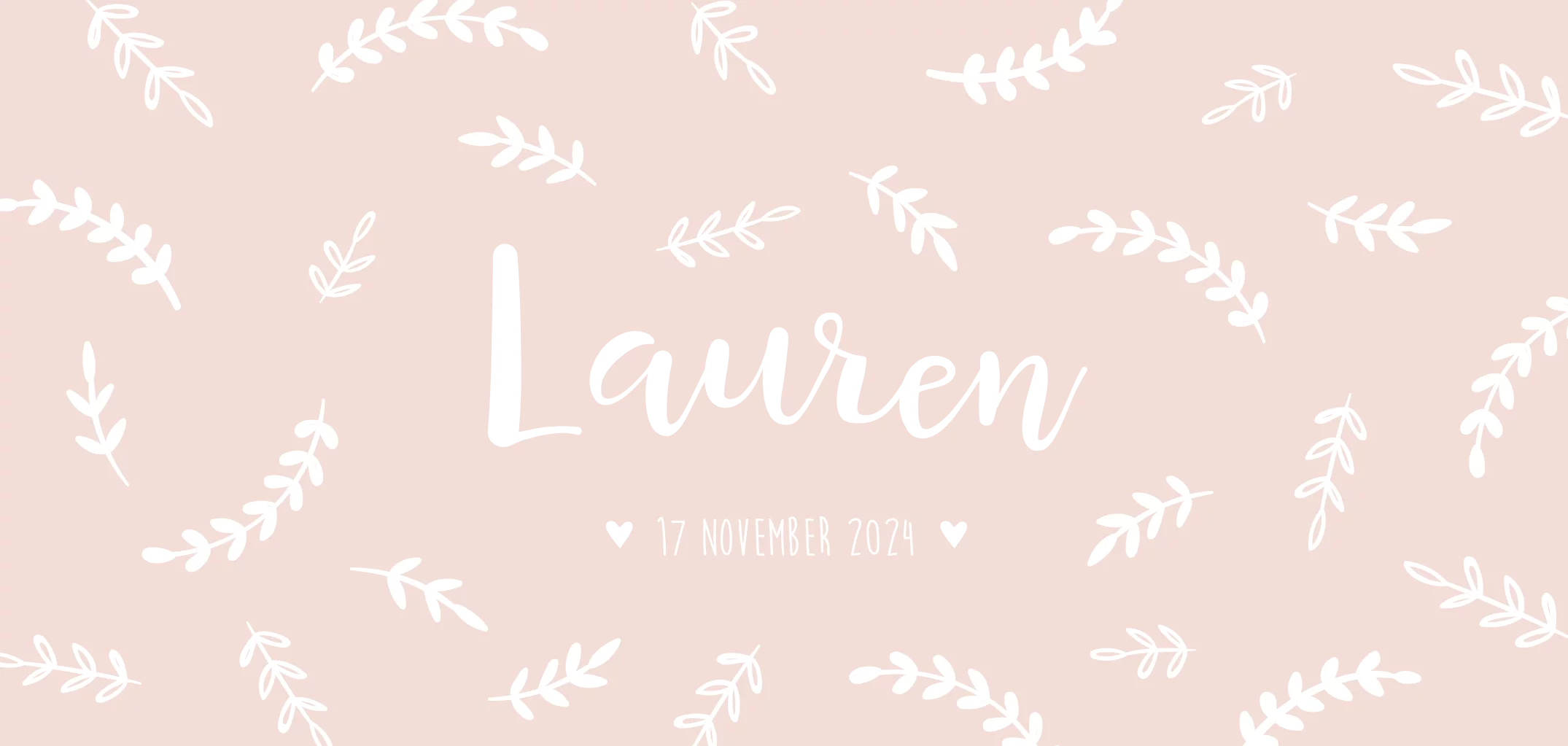 Botanisch geboortekaartje met witte blaadjes en een zalmroze achtergrond kleur. De naam en hartjes op de voorzijde in goudfolie. Pas de kleur van de kaart en de folie naar wens aan.