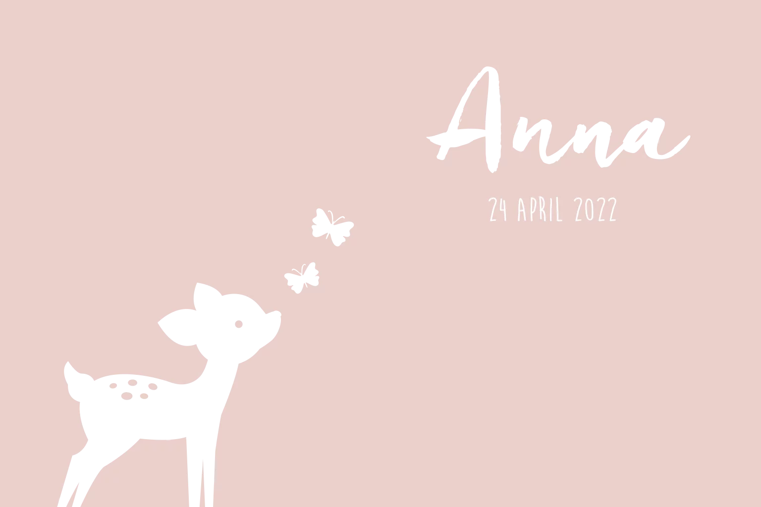 Een lief lichtroze geboortekaartje voor een meisje. Het kaartje heeft een goudfolie vlinder en hertje. In de binnenkant van de kaart is er plaats voor een klein gedichtje. De kleur van de kaart en de folie pas je zelf in de editor naar wens aan.