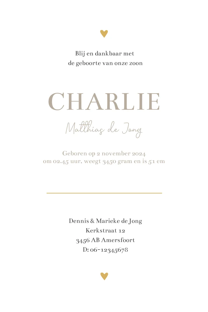 Lief dubbel gevouwen geboortekaartje met een witte achtergrond en beige bladeren. Afgewerkt met goudfolie. Op de voorzijde kun je een foto toevoegen van jullie kindje en aan de binnenzijde is plaats voor een mooi gedichtje. Fotografie: Anouk Wubs - www.anoukwubs.nl