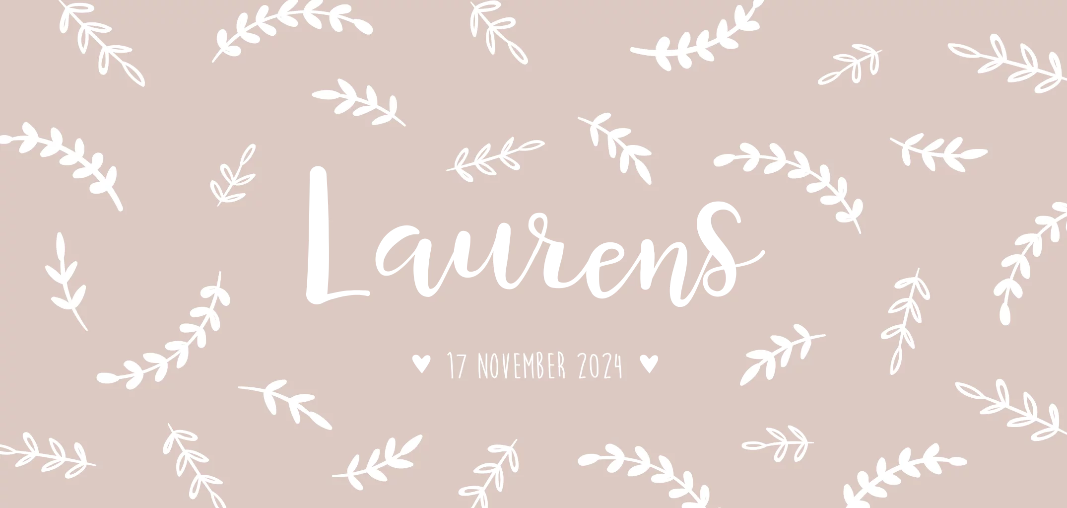 Langwerpig geboortekaartje met takjes en de naam in goudfolie op een beige achtergrond. Pas de kleur van de kaart en de folie naar wens aan.