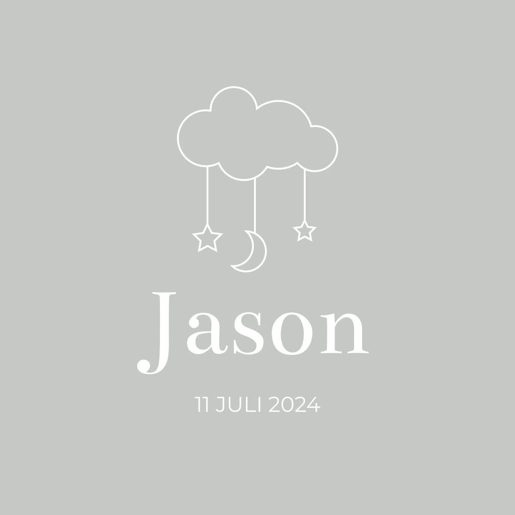 Lief dubbel gevouwen geboortekaartje in een grijs groene kleur met een wolkje en maan en sterren. Afgewerkt met goudfolie. Pas de kleur van de kaart en folie naar wens aan.