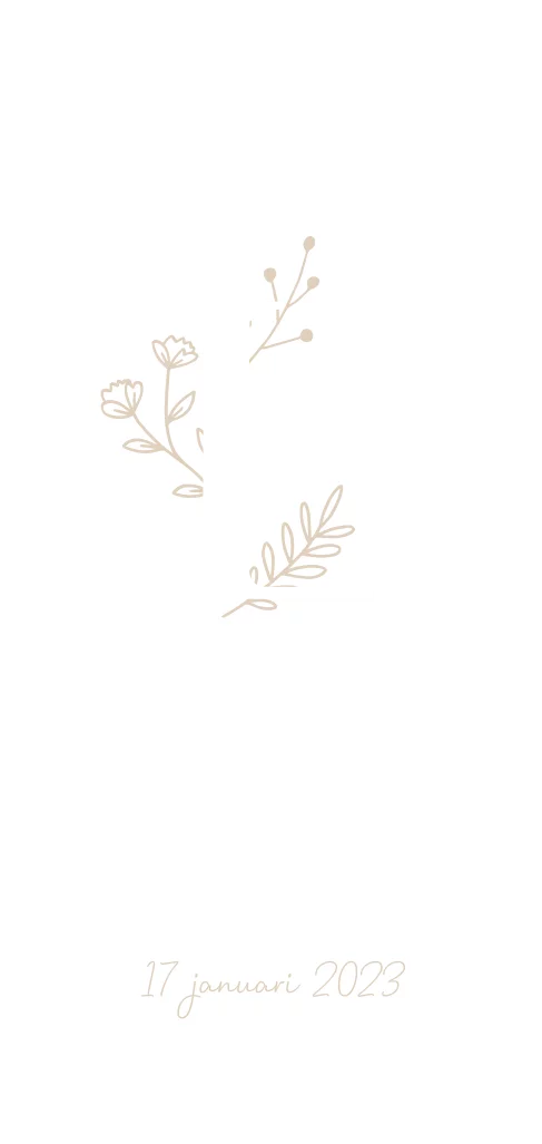 Langwerpig geboortekaartje met takjes en de eerste letter van de naam in rosefolie op een witte achtergrond. Afgewerkt met ronde hoeken. Pas de kleur van de kaart en de folie naar wens aan.