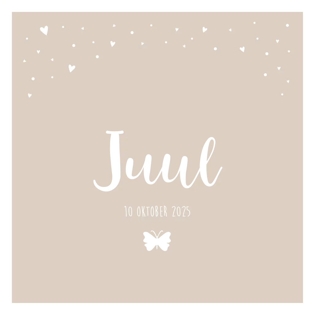 Lief enkel geboortekaartje in een beige kleur met witte hartjes en een vlinder. Afgewerkt met rosefolie. Pas de kleur van de kaart naar wens aan.