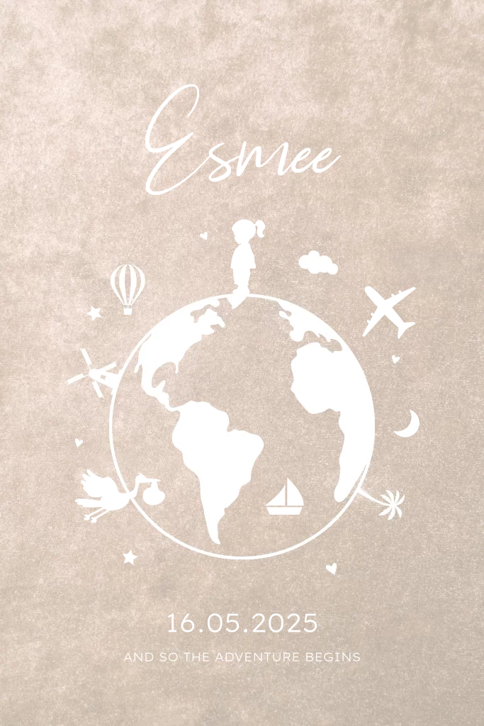 Een lief en neutraal geboortekaartje volgens de laatste trends! Op dit beige velvet look geboortekaartje staat een wereldbol en is afgewerkt met glimmende goudfolie. Aan de binnenzijde van de kaart is plek voor alle informatie en een mooi gedichtje. Pas de kleuren van het geboortekaartje nog naar wens aan.