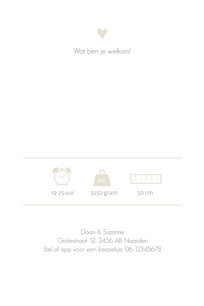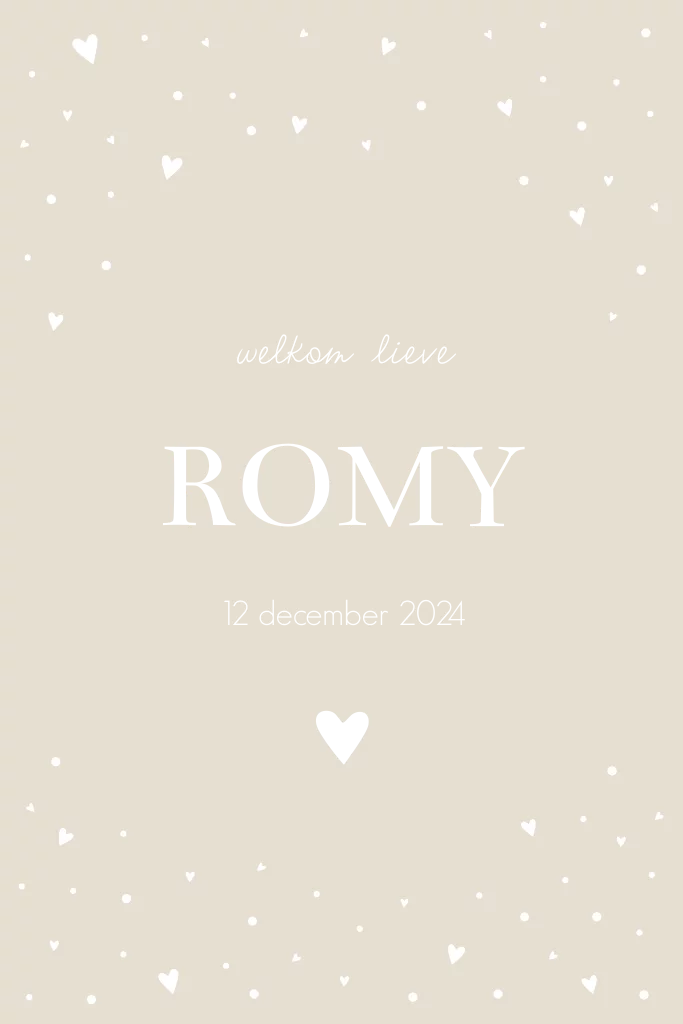 Een lief en neutraal geboortekaartje volgens de laatste trends! Op dit beige geboortekaartje staan witte hartjes en de kaart is afgewerkt met glimmende goudfolie. Aan de binnenzijde van de kaart is plek voor alle informatie en een mooi gedichtje. Pas de kleuren van het geboortekaartje nog naar wens aan.