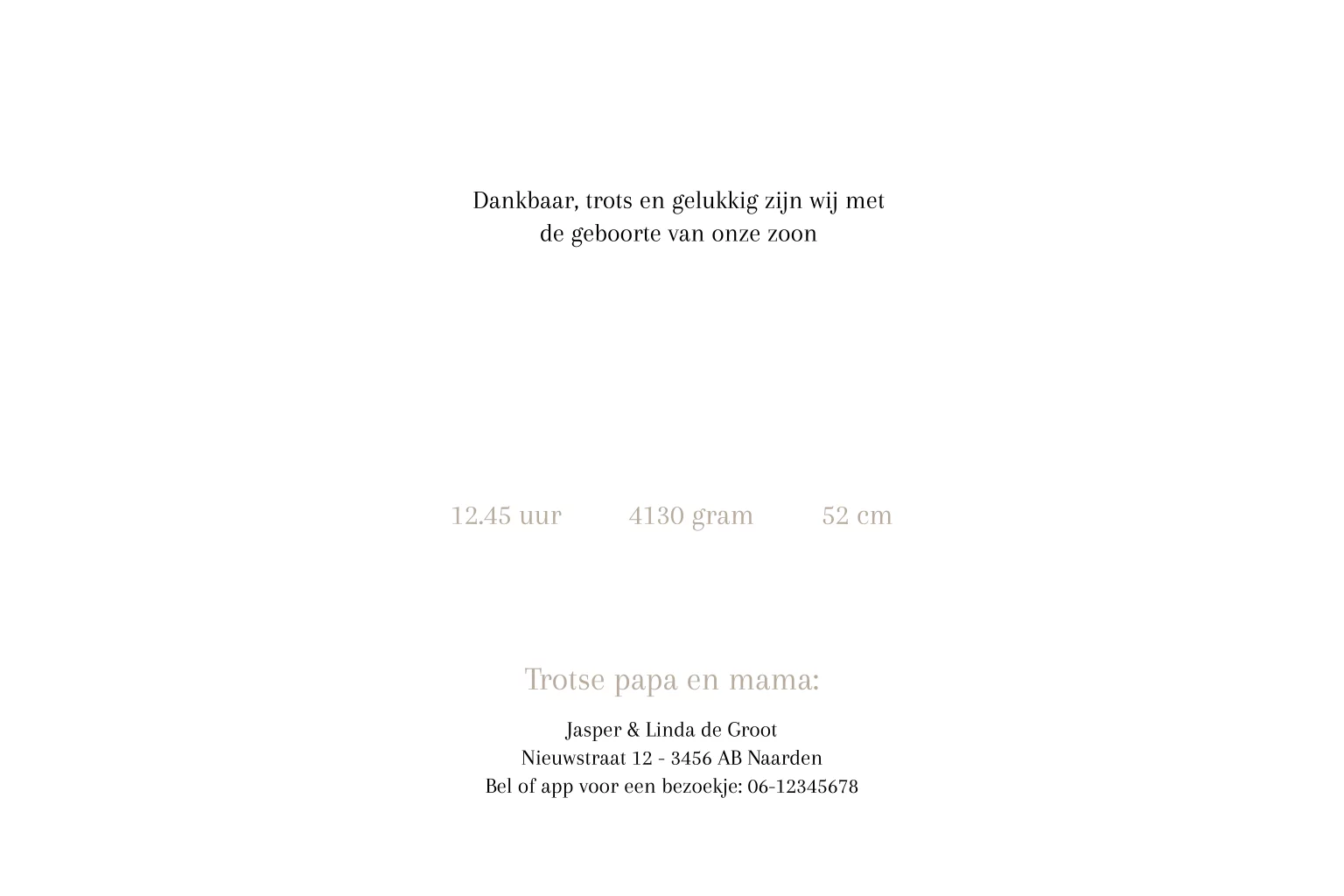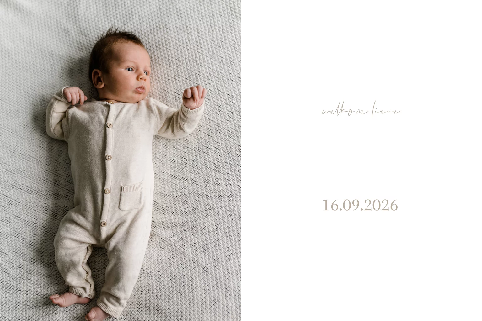 Een wit neutraal geboortekaartje met een foto. Het kaartje heeft een witte kleur en is afgewerkt met goudfolie. Aan de binnenzijde is ook plaats voor een foto van jullie kindje. Pas de kleuren en de folie nog naar wens aan in de editor. Fotografie: Anouk Wubs - www.anoukwubs.nl