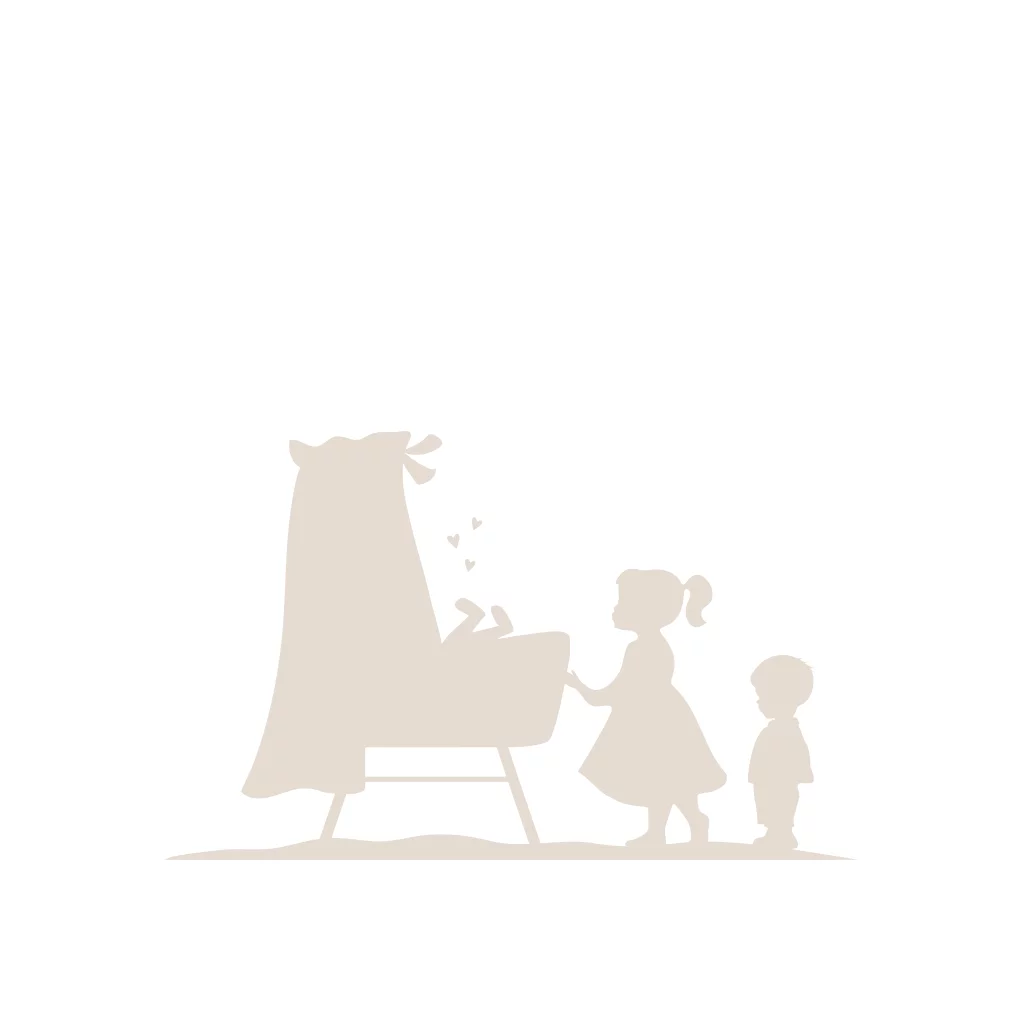 Lief dubbel gevouwen geboortekaartje met goudfolie en beige silhouet van wiegje en grote broer en zus. Pas de kleur van de kaart naar wens aan. In de beeldbank kun je nog meer silhouetten vinden en het ontwerp nog aanpassen naar jullie gezinssamenstelling.