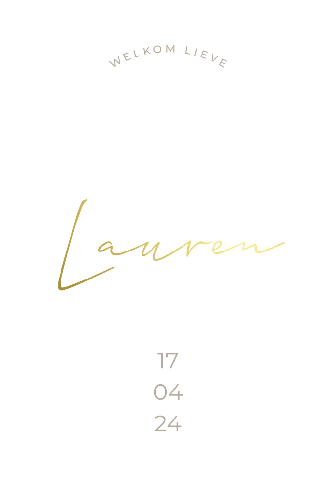 Een lief neutraal geboortekaartje in boogvorm met goudfolie. Het kaartje heeft een witte achtergrond en de naam in sierlijke letters. Je kunt de kaart zelf nog helemaal naar wens aanpassen.