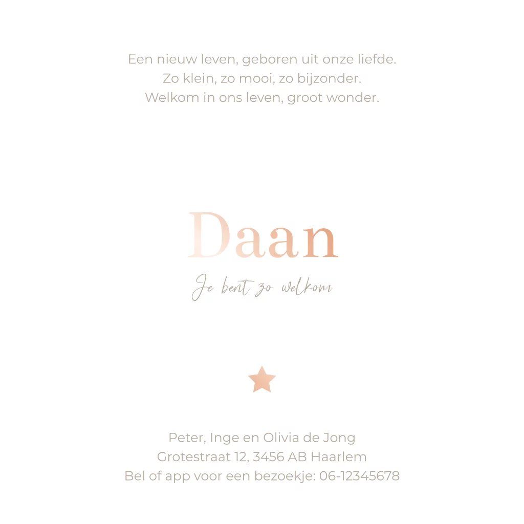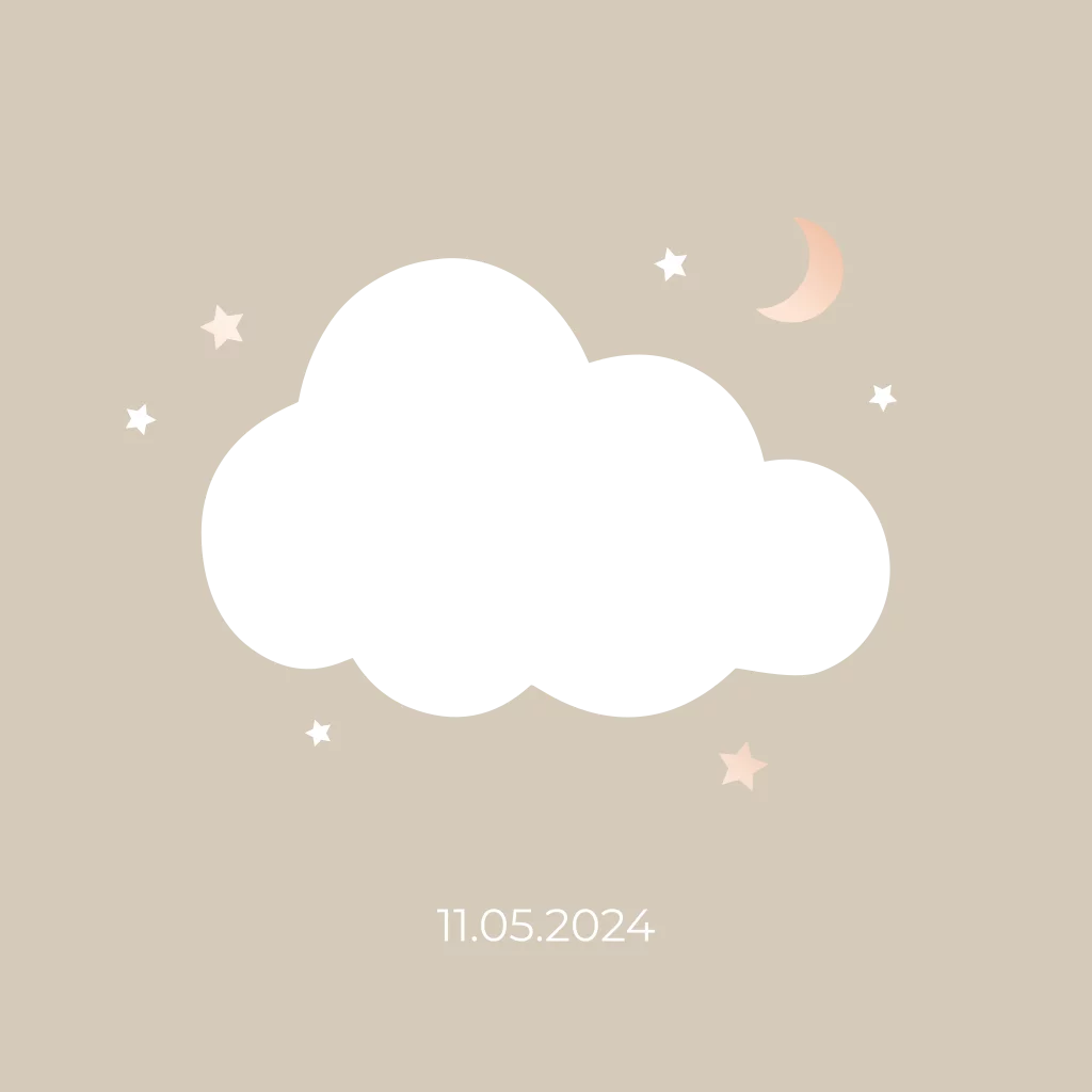 Een neutraal geboortekaartje in een uniek formaat met maan en sterren! Het kaartje heeft een doorkijkje met een uitgestanste wolk, waardoor je de tekst aan de binnenzijde kunt lezen. Dit unisex geboortekaartje heeft een beige kleur achtergrond en is afgewerkt met rosefolie. Pas de kleuren van de kaart en de folie nog helemaal naar wens aan.